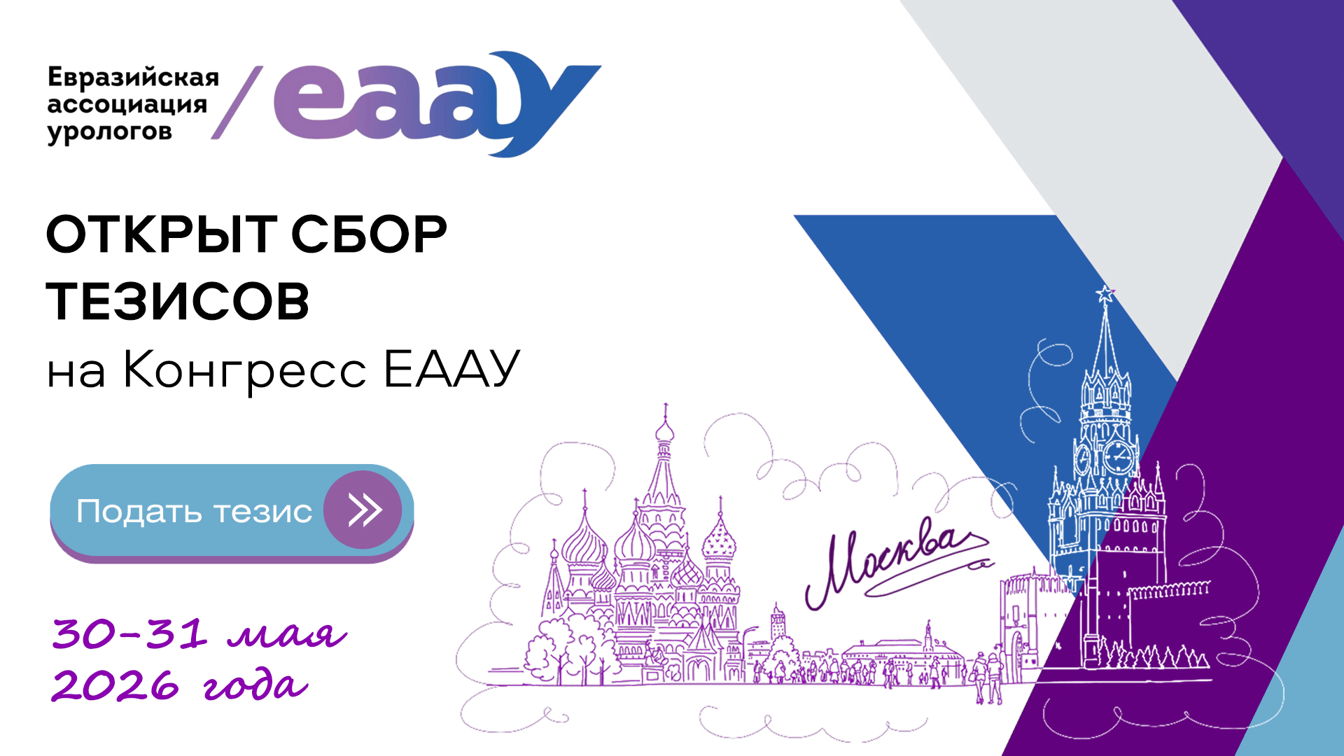Уважаемые коллеги, на странице мероприятия Конгресса Евразийской Ассоциации урологов (EAAУ) открыт прием тезисов. Свой тезис Вы можете подать через кнопку Добавить тезис. Список всех Ваших поданных тезисов отобразится в разделе Мои тезисы со статусом На рассмотрении. После проверки статус поменяется на Принят.